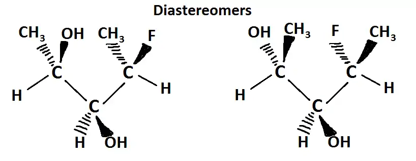 Diastereomers are any stereoisomers that are not enantiomers. Thus, diastereomers are not mirror images of each other. Because diastereomers are stereoisomers that aren't mirror images of each other, they can be distinguished by different physical and chemical properties. Thus, it is possible to separate diastereomers by standard laboratory techniques. Diastereomers arise when stereoisomers of a molecule have different configurations at at least one of their stereocenters (but not all, for they would then be enantiomers). Each stereocenter possesses two configurations, so the number of stereoiosmers is increased by a factor of two. Cis/trans isomerism is a form of diastereomerism (cis-two substituents pointing in the same direction; trans-two substituents pointing in opposite directions).