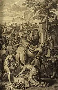 So Jacob set his sons and his wives on camels and headed out toward Isaac and Canaan with all the animals and wealth that he had collected in Padan-aram. Jacob tricked Laban by fleeing secretly while Laban was out shearing his sheep, and Rachel stole her father’s idols. On the third day, Laban heard that Jacob had fled and he and his kin pursued after Jacob seven days, overtaking him in the mountain of Gilead. God came to Laban in a dream and told him not to speak to Jacob either good or bad. But when Laban caught up with Jacob, he asked Jacob what he meant by carrying away his daughters secretly, like captives, without letting him kiss his daughters and grandchildren goodbye. Laban said that while he had the power to harm Jacob, God had told him the previous night not to speak to Jacob either good or bad, and now Laban wanted to know why Jacob had stolen his gods. Jacob answered that he fled secretly out of fear that Laban might take his daughters by force, and not knowing Rachel stole the gods, he told Laban that whoever had his gods would die. Laban searched Jacob's tent, Leah's tent, and the two maid-servants’ tent, finding nothing, and then he entered Rachel's tent. Rachel had hidden the idols in the camel’s saddle and sat upon them, apologizing to her father for not rising, as she was having her period. Laban searched and felt about the tent, but did not find the idols. Angered, Jacob questioned Laban what he had done to deserve this hot pursuit and this searching. Jacob protested that he had worked for Laban for 20 years, through drought and frost, bearing the loss of animals torn by predators, and not eating Laban’s rams, only to have his wages changed 10 times. Had not the God of Isaac been on Jacob’s side, surely Laban would have sent Jacob away empty, Jacob said, and God had seen his affliction and awarded him what he deserved. Laban answered Jacob that they were his daughters, his children, and his flocks, but asked what he could do about it now.