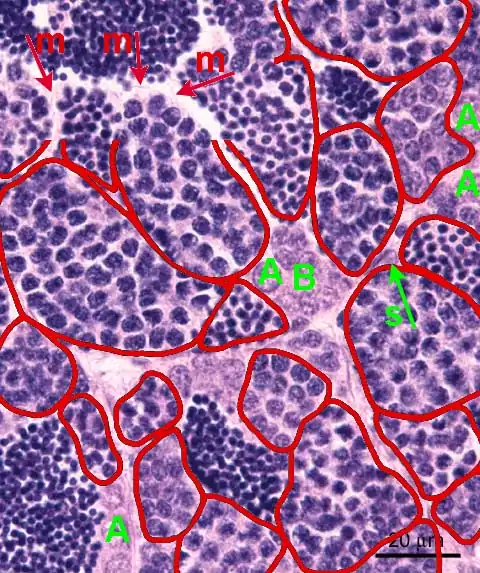Each cluster of meiotic cells that arises from spermatogonial division shows synchronous maturation, and such spermatocysts [outlined in red, left image] are enveloped by the thin layer of the membrane of lobule boundary cells [m], which are adapted Sertoli cells. When spermatogenesis is completed, these lobule boundary cells open up to void the mature sperm into the tubular lumen.