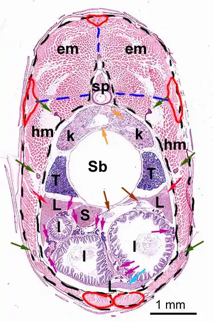 The axial section below of an adult male zebrafish is from the rostral part of the abdominal cavity, where the testis [T] is in the upper part, between swim bladder [sb] and abdominal wall. The area of testis will show largely similar in more caudal sections. The abdominal organs shown in this image are liver [L], pancreas [arrows], spleen [S], intestinal loops [I]. Major blood vessels in this section are dorsal aorta [upper arrow] and posterior cardinal vein [lower arrow], embedded in the kidney [k] intestinal arteries [arrows], intestinal veins [arrows] and epigastric vein [arrow], partly embedded in the liver. The horizontal skeletogenous septum [horizontal line] separates the epaxialis [em] and hypaxialis muscles [hm], which are inserted to this septum and to the spine [sp], and which are also bound to the skin. In the midline, the epaxial muscles insert to the vertical skeletogonous septum [vertical line]. Although organised in myotomes which are oriented perpendicular to the length axis of the fish, these muscles appear cross-sectioned due to their waved course [middle diagram]. The epaxialis includes the dorsal supracarinalis muscles [upper outline], the hypaxialis includes the ventral infracarinalis muscles [lower outline]. The lateralis superficialis muscles [left/right outlines] overlay the peripheral part of the horizontal septum. Pleural rib structures [arrows] can be observed within the hypaxialis. |