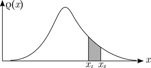 We call a probability density because it represents a probability per unit length. The probability of finding in the interval between and is given by the area between the graph of the axis, and the vertical lines at and respectively.