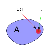 Definition: We say that x is an interior point of A iff there is an such that: . This intuitively means, that x is really 'inside' A - because it is contained in a ball inside A - it is not near the boundary of A.