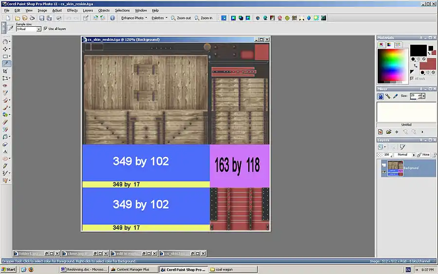 If you open the cs_skin_reskin.tga in the zip file you can see the sizes of these sides and ends. For a photo reskin simply resize the side photo and end photos to these sizes and position them appropriately. You will still need to change the colour of the two squares in the top right corner.