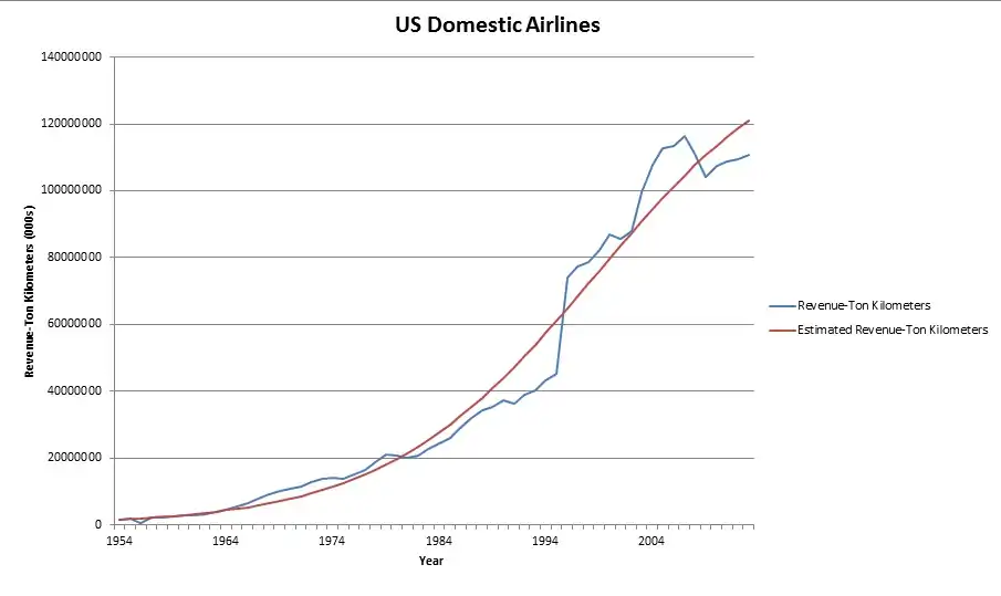 Using revenue-ton statistics from the United States Department of Transportation; I was able to find annual total revenue-ton miles flown on scheduled service from 1954-2013 for both passenger and freight aviation and convert these numbers to revenue-ton kilometers flown. Data from 1954-1995 was estimated by the Bureau of Transportation Statistics from a ten-percent sample of all scheduled traffic (both international and domestic) as recorded from only major, national, Large Regional, and Medium Regional operators while not including statistics for small or commuter air carriers as defined and collected by BTS Form 41A.[17][18] To correct the 1954-1995 data to remove international traffic the ratio of domestic/total revenue miles flown in 1954 was used to correct all 1954-1995 data.[19] The data collected by the Bureau of Transportation Statistics from 1996-2013 was collected from all operators including small and commuter air carriers, with a 100% sample/from the entire population, and was separated by domestic and international traffic.[20] The 1954-2013 regression was run to model the following logistic equation: S(t)=K/[1+Exp(-b(t-t0)]