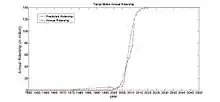 The red line represents the predicted ridership and the blue line stands for the actual annual ridership. It can be seen from the graph that the predicted ridership is in good agreement of the actual annual ridership. But the two inflexion points in predicted ridership S Curve show steep slopes, which is not common mitigate change. Two reasons might explain this phenomenon. First, the construction of Tianjin Metro has been suspended for several times, so its market was depressed in the early time. But after year 2000, with largely strengthened policy and capital support and advanced construction and operation technology, Tianjin Metro has stepped into a rapid development, which is consistent with the model graph. Second, the development of Tianjin Metro goes through about 40 years, which is not a short time. The lack of historical data may result in this “error” as well. However, it can be seen for the model graph that Tianjin Metro reached the 2/3 of its life-cycle. In studies of life-cycle of Beijing Metro[15] and Shanghai Metro[16], the development stage of these two Metro system is between 1/2 and 2/3 of the life-cycle. Tianjin is one of the four municipalities in China. And, as it special location, just beside Beijing, its Metro system development is very likely to be proportional to Beijing’s, so the model fitting result is convincing to some degree. In sum, the fitting curve above can represent for the life-cycle of Tianjin Metro.