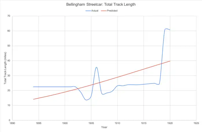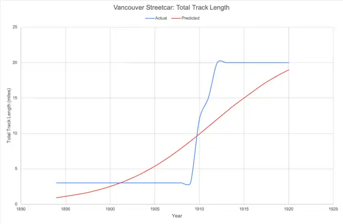 The 'McGraw Electric Railway Manual - the red book of American street railway investment' was used in order to analyze the lifecycle of streetcars in Washington from 1894 to 1920. It was expected that the total track length forms an S-curve, the S-curve model uses the three-parameter equation below: