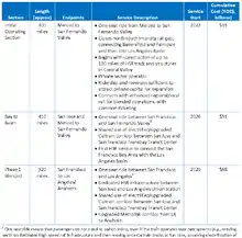 At this stage, the dedicated HSR system will be built northwest to San Jose, providing passengers with the ability to ride one-seat from San Fernando Station to San Francisco. However, this plan relies on assumptions that Caltrain will electrify their lines by 2020 as proposed. It also should be noted that this one-seat trip will not be on dedicated HSR tracks the entire way. From San Francisco to San Jose, passengers would rely on "blended" infrastructure, which means that the high-speed train would actually be traveling on electrified Caltrain tracks. The trip from San Fernando Valley to Los Angelos would be via Metrolink. The only dedicated HSR track would be from San Jose to San Fernando Valley.