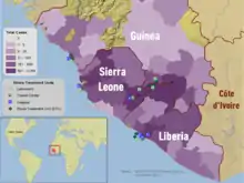 - ↑ Centers for Disease Control (October 2014). 2014 Ebola Outbreak in West Africa – Outlook Distribution Map. From http://www.cdc.gov/vhf/ebola/outbreaks/2014-west-africa/distribution-map.html