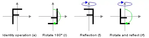 The dihedral group D2 is generated by the rotation r of 180 degrees, and the reflection s across the x-axis. The elements of D2 can then be represented as {e, r, s, rs}, where e is the identity or null transformation and rs is the reflection across the y-axis.