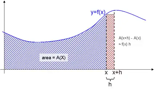 At this point we know that A(x + h) − A(x) is approximately equal to ƒ(x)·h, and we intuitively understand that this approximation becomes better as h grows smaller. In other words, ƒ(x)·h ≈ A(x + h) − A(x), with this approximation becoming an equality as h approaches 0 in the limit.