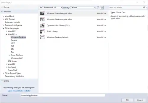 By default, it will point to the language you selected at startup. Choose a name and hit OK. In this case, we chose a C++ Windows Console Application.