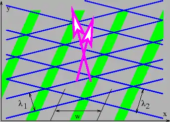 An example of the production of beams by the superposition of two waves with different directions and wavelengths is shown in figure 2.10. Notice that the wavefronts are still horizontal, as in figure 2.8, but that the beams are not vertical, but slant to the right.