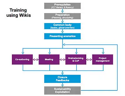 • Quite a few prerequisites, aiming that no one starts the face-to-face training without theories and practices; anyone should see that wikiculture is an entire emerging "sustainable" socio-economical environment, not only a software or an encyclopedia. These prerequisites should take a maximum 45 minutes (ideally 20-30 minutes), so that the participants are already involved when they start the training, but not overcharged of preliminary work either.