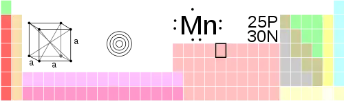 It is in steel, batteries, and ceramics. It was found in cave paintings in France. Its atomic number is 25. Maganese-53 is radioactive, with a half-life of 3.74 years (the time it takes for half of the radioactive material to be gone). It has 25 protons and 30 neutrons.