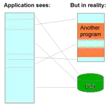 The program thinks it has a large range of contiguous addresses; but in reality the parts it is currently using are scattered around RAM, and the inactive parts are saved in a disk file.