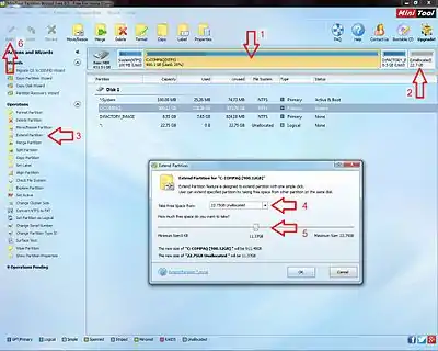 - Select the source of the space to use in making the extension of C:, using the drop-down list. (Choose Unallocated.) (4)
