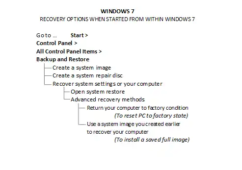 - The second drop-box, Specific Recovery Options for Windows 7 displays facilities, the details of which have been arranged in a tree format that show the route to any function from the starting point. Three sections were necessary; one for starting within Windows, another for the f8 start during bootup, and one where a startup-repair disc is required.