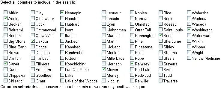 Sometimes you have a large number of items to select from, for example you want to include one of many counties within a state to include in your search. In the following example there are 87 counties that might be included in a search. These county names are places in seven columns with 13 counties in all but the last column.