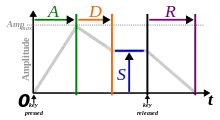Taking the example of an electronic keyboard, attack followed by decay are heard when pressing a key, sustain is the actual note while the key is down, and release happens when freeing the key.