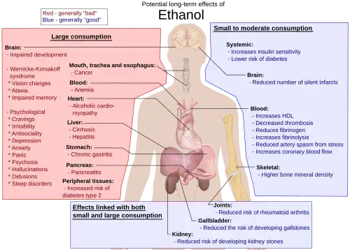| Complications | Mental illness, delirium, Wernicke–Korsakoff syndrome, irregular heartbeat, cirrhosis of the liver, cancer, fetal alcohol spectrum disorder, suicide[3][4][5][6] |