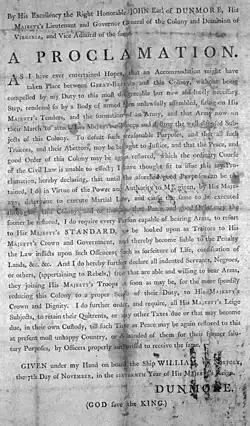 On 7 November 1775, during the American War of Independence, John Murray, Lord Dunmore, issued a proclamation that offered freedom to the slaves of rebel masters if they enlisted to put down the colonial rebellion. Dunmore was the last Royal Governor of Virginia, appointed by King George III in July 1771. Dunmore's Proclamation inspired slaves to escape from captivity and fight for the British. On 30 June 1779, George III's Commanding General Henry Clinton broadened Dunmore's proclamation with his Philipsburg Proclamation. For all colonial slaves who fled their rebel masters, Clinton forbade their recapture and resale, giving them protection by the British military. Approximately 20,000 freed slaves joined the British, fighting for George III. In 1783, given British certificates of freedom, 3,000 former slaves, including their families, settled in Nova Scotia.[142]