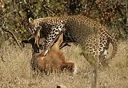 The leopard depends mainly on its acute senses of hearing and vision for hunting.[122] It primarily hunts at night in most areas.[66] In western African forests and Tsavo National Park, they have also been observed hunting by day.[123] They usually hunt on the ground. In the Serengeti, they have been seen to ambush prey by descending on it from trees.[124] It stalks its prey and tries to approach as closely as possible, typically within 5 m (16 ft) of the target, and, finally, pounces on it and kills it by suffocation. It kills small prey with a bite to the back of the neck, but holds larger animals by the throat and strangles them.[66] It caches kills up to 2 km (1.2 mi) apart.[75] It is able to take large prey due to its powerful jaw muscles, and is therefore strong enough to drag carcasses heavier than itself up into trees; an individual was seen to haul a young giraffe weighing nearly 125 kg (276 lb) up 5.7 m (18 ft 8 in) into a tree.[123] It eats small prey immediately, but drags larger carcasses over several hundred metres and caches it safely in trees, bushes or even caves; this behaviour allows the leopard to store its prey away from rivals, and offers it an advantage over them. The way it stores the kill depends on local topography and individual preferences, varying from trees in Kruger National Park to bushes in the plain terrain of the Kalahari.[67][125]