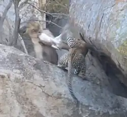In Kruger National Park, most leopards tend to keep 1 km (0.62 mi) apart.[112] Males occasionally interact with their partners and cubs, and exceptionally this can extend beyond to two generations.[75][113] Aggressive encounters are rare, typically limited to defending territories from intruders.[67] In a South African reserve, a male was wounded in a male–male territorial battle over a carcass.[107]