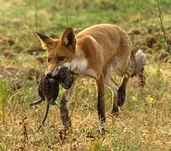 Red foxes are usually found in pairs or small groups consisting of families, such as a mated pair and their young, or a male with several females having kinship ties. The young of the mated pair remain with their parents to assist in caring for new kits.[9] The species primarily feeds on small rodents, though it may also target rabbits, squirrels, game birds, reptiles, invertebrates[7] and young ungulates.[7] Fruit and vegetable matter is also eaten sometimes.[10] Although the red fox tends to kill smaller predators, including other fox species, it is vulnerable to attack from larger predators, such as wolves, coyotes, golden jackals, large predatory birds such as golden eagles and Eurasian eagle owls,[11] and medium- and large-sized felids.[12]