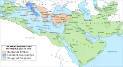 The northern Mesopotamian Assyrian kingdom of Adiabene controlled areas of north east Syria between 10 and 117, before it was conquered by Rome.[60] The Aramaic language has been found as far afield as Hadrian's Wall in Roman Britain,[61] with an inscription written by a Palmyrene emigrant at the site of Fort Arbeia.[62] Control of Syria eventually passed from the Romans to the Byzantines with the split in the Roman Empire.[36] The largely Aramaic-speaking population of Syria during the heyday of the Byzantine Empire was probably not exceeded again until the 19th century. Prior to the Arab Islamic Conquest in the 7th century, the bulk of the population were Arameans, but Syria was also home to Greek and Roman ruling classes, Assyrians still dwelt in the north east, Phoenicians along the coasts, and Jewish and Armenian communities were also extant in major cities, with Nabateans and pre-Islamic Arabs such as the Lakhmids and Ghassanids dwelling in the deserts of southern Syria. Syriac Christianity had taken hold as the major religion, although others still followed Judaism, Mithraism, Manicheanism, Greco-Roman Religion, Canaanite Religion and Mesopotamian Religion. Syria's large and prosperous population made Syria one of the most important of the Roman and Byzantine provinces, particularly during the 2nd and 3rd centuries AD.[63]