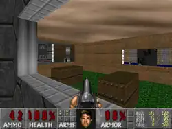 Freedoom, a clone of the first-person shooter Doom. Common elements include a heads-up display along the bottom that includes the player's remaining health and ammunition.