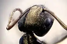 An ant's head contains many sensory organs. Like most insects, ants have compound eyes made from numerous tiny lenses attached together. Ant eyes are good for acute movement detection, but do not offer a high resolution image. They also have three small ocelli (simple eyes) on the top of the head that detect light levels and polarization.[41] Compared to vertebrates, ants tend to have blurrier eyesight, particularly in smaller species,[42] and a few subterranean taxa are completely blind.[3] However, some ants, such as Australia's bulldog ant, have excellent vision and are capable of discriminating the distance and size of objects moving nearly a meter away.[43] Based on experiments conducted to test their ability differentiate between selected wavelengths of light, some ant species such as Camponotus blandus, Solenopsis invicta, and Formica cunicularia are thought to possess a degree of colour vision.[44]