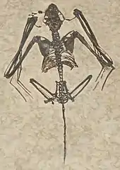 The delicate skeletons of bats do not fossilise well; it is estimated that only 12% of bat genera that lived have been found in the fossil record.[6] Most of the oldest known bat fossils were already very similar to modern microbats, such as Archaeopteropus (32 million years ago). The oldest known bat fossils include Archaeonycteris praecursor and Altaynycteris aurora (55-56 million years ago), both known only from isolated teeth.[7][8] The oldest complete bat skeleton is Icaronycteris gunnelli (52 million years ago), known from two skeletons discovered in Wyoming.[9][10] The extinct bats Palaeochiropteryx tupaiodon and Hassianycteris kumari, both of which lived 48 million years ago, are the first fossil mammals whose colouration has been discovered: both were reddish-brown.[11][12]