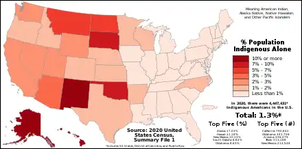 ![]() Proportion of Indigenous Americans in each of the 50 states, Washington, D.C., and Puerto Rico as of the 2020 census | |