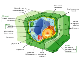 Plant cells have distinctive features that other eukaryotic cells (such as those of animals) lack. These include the large water-filled central vacuole, chloroplasts, and the strong flexible cell wall, which is outside the cell membrane. Chloroplasts are derived from what was once a symbiosis of a non-photosynthetic cell and photosynthetic cyanobacteria. The cell wall, made mostly of cellulose, allows plant cells to swell up with water without bursting. The vacuole allows the cell to change in size while the amount of cytoplasm stays the same.[54]