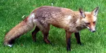 The red fox (Vulpes vulpes) is the largest of the true foxes and one of the most widely distributed members of the order Carnivora, being present across the entire Northern Hemisphere including most of North America, Europe and Asia, plus parts of North Africa. It is listed as least concern on the IUCN Red List.[1] Its range has increased alongside human expansion, having been introduced to Australia, where it is considered harmful to native mammals and bird populations. Due to its presence in Australia, it is included on the list of the "world's 100 worst invasive species".[4]