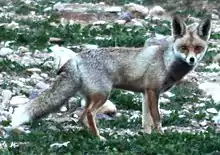 Although European foxes (V. v. crucigera) were introduced to portions of the United States in the 1900s, recent genetic investigation indicates an absence of European fox mitochondrial haplotypes in any North American populations.[27] Additionally, introduced eastern North American red foxes have colonised most of inland California, from Southern California to the San Joaquin Valley, Monterey and north-coastal San Francisco Bay Area (including urban San Francisco and adjacent cities). In spite of the red fox's adaptability to city life, they are still found in somewhat greater numbers in the northern portions of California (north of the Bay Area) than in the south, as the wilderness is more alpine and isolated. The eastern red foxes appear to have mixed with the Sacramento Valley red fox (V. v. patwin) only in a narrow hybrid zone.[28] In addition, no evidence is seen of interbreeding of eastern American red foxes in California with the montane Sierra Nevada red fox (V. v. necator) or other populations in the Intermountain West (between the Rocky Mountains to the east and the Cascade and Sierra Nevada Mountains to the west).[29]
