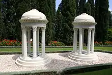 He commissioned two marble monuments to be built made in Corinthian style from Italy.[23] After successfully transferring the remains, Shoghi Effendi reburied the two next to each other in a ceremony on Christmas Day of 1939.[23] The burial ground is now called the Monument Gardens, the burial ground of the Baháʼí "holy family", namely the wife, son, daughter and daughter-in-law of Baháʼu'lláh.[23]