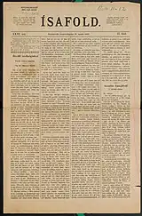 Ísafold was an Icelandic newspaper, published weekly. It was founded in 1874 by the politician Björn Jónsson,[1] who was the editor until 1909, when he became prime minister.