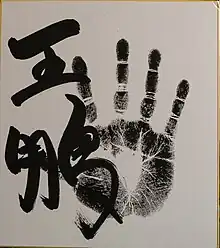 His promotion to sekitori status saw him adopt the shikona Ōhō (王鵬).[13] Ōtake-oyakata (former jūryō wrestler Dairyū), Ōhō's stablemaster, commented that he had considered giving Ōhō the shikona Taihō (大鵬) but could not because Taihō was also the name of a non-transferable elder share (ichidai toshiyori) within the Sumo Association.[14] He therefore replaced the character Dai (大) with Ō (王) as a bit of wordplay to evoke the memory of Taihō and the solid mentality of Ōhō.[13] The character Ō (王) can be pronounced the same as the character Dai (大) which is commonly used by wrestlers of Ōtake stable in deference to both the founder's (Taihō) and the current stablemaster's (Dairyū) shikona. The character Hō (鵬) is taken directly from Taihō's shikona.[15]