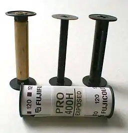 Original 120, 620 and modern 120 film spools with modern 120 exposed color film