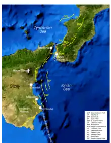 The region of Calabria is located between the Tyrrhenian and Ionian Seas, where active extension is ongoing. Extension is accommodated by normal faults on the Tyrrhenian side in Calabria. The trend of normal faults extend southwards to the Strait of Messina, where they occur on the Ionian side in Sicily. Known as the Siculo–Calabrian rift, this active geological feature is characterized by its high seismicity of earthquakes up to Mw 7.1.[2]