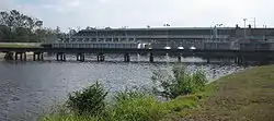 A portion of the 17th Street Canal, looking lakeward from behind the Metairie Road Pumping Station. Note the levees topped with concrete flood walls.