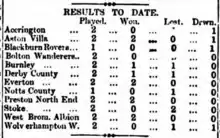 Preston's 100% record was maintained when they won 3–2 at Derby County while second placed Aston Villa set a record victory up to that time when they defeated bottom club Notts County 9–1. Bolton recorded their first ever league victory at the fourth attempt, 6–2 against Everton.