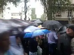 The protest in Buenos Aires took place under a torrential storm. It was attended by thousands of people anyway, and the street was filled with umbrellas and Argentine flags. It started at 19:00 at the Congressional Plaza, continued through Avenida de Mayo with a stop at Nisman's working place, and ended at Plaza de Mayo. It was organized as a silent demonstration, only as an homage to Alberto Nisman, and devoid of political flags or banners. The rule was followed, with occasional exceptions for waves of spontaneous clapping or people singing the Argentine national anthem. The city police estimated that the demonstration was attended by 400,000 people.[1]