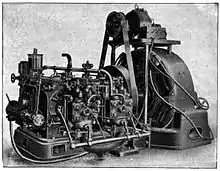 Various petrol engines were used, an 85 hp Napier engine was the first to be installed, but these were found to be unsatisfactory, so were replaced in 1904 by Wolseley engines. These flat-four engines produced 92 bhp at their normal rated speed of 400 rpm, and well over 100 bhp when run at 480 rpm. The cylinders were 8.5 inch diameter with 10 inch stroke. The engine had a 3-foot diameter flywheel, and was coupled directly to a Westinghouse multi-polar dynamo. A small dynamo driven by belt from the flywheel provided charge for the accumulators which enabled electric starting of the engine, lighting for the carriage, and the 'exciting current' for the field coils in the main dynamo, controlled by rheostats at either end of the railcar. The engine speed could likewise be controlled via a throttle from either end of the railcar. The output from the main dynamo was sent to two electric motors, both mounted on the bogie underneath the engine room.[1]