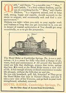 Rider was a successful publicist for his hotel, and the chess tournament of 1904 was an outgrowth of those efforts. Over two hundred reporters from around the world were present at the Rider Hotel. Financed primarily by Rider and the Erie Railroad Company, the tournament received additional support from Professor Isaac Leopold Rice as well as by selling tournament bulletins to chess clubs around the country.[2] It was originally intended that the chess tournament be a yearly affair; however, Rider died in 1905 and the prospect of future tournaments died with him.