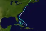 Historical weather maps indicate the presence of a tropical storm about 535 mi (860 km) east-northeast of Barbados on September 7.[1][5] Moving west-northwestward, the storm passed just north of the Lesser Antilles and slowly intensified, becoming a hurricane just offshore the Dominican Republic early on September 11. Thereafter, the cyclone strengthened more quickly, becoming a Category 2 hurricane just prior to striking Inagua in the Bahamas several hours later with winds of 100 mph (160 km/h). Around 12:00 UTC on September 12, the system strengthened into a Category 3 hurricane and peaked with maximum sustained winds of 120 mph (190 km/h) by early the following day. The storm curved northward and passed over or near several islands on September 13 and September 14, including Exuma, Cat Island, and Eleuthera. Later on September 14, the cyclone turned northeastward and exited the island chain. While traversing the open Atlantic, the system slowly weakened and remained a hurricane until falling to tropical storm intensity late on September 18 while just offshore Newfoundland. The storm soon struck the island and became extratropical near Port Rexton. The extratropical remnants continued northeastward and dissipated over the Labrador Sea late the following day.[1]