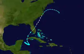 A tropical depression developed near the Yucatan Peninsula early on November 27.[6] The depression drifted southeastward and gradually strengthened into a tropical storm.[6] Once in the gulf, it accelerated and intensified to winds of 65 mph (105 km/h).[10] Early on December 1, the storm made landfall near Fort Myers, Florida, at the same intensity. The system weakened and soon became extratropical. The extratropical cyclone emerged over the eastern Atlantic several hours later and regained hurricane-force winds. By 0000 UTC, the extratropical system peaked with winds of 90 mph (140 km/h) and a minimum pressure of 980 mbar (29 inHg).[6] Around this time, the U. S. S. Patoka, which was in the vicinity of the storm, recorded a pressure of 978.5 mbar (28.90 inHg).[2] The northeastward movement slowed shortly after crossing Florida.[6] Around 2300 UTC, it made landfall between Wilmington and Cape Hatteras[2] with winds equivalent to a minimal hurricane. Shortly after landfall, maximum sustained winds in the storm dropped below 75 mph (121 km/h).[6] A strong area of high pressure located over the Canadian Maritimes caused the system to turn east-southeastward.[2] On December 5, the storm weakened further to the equivalent of a tropical depression as the system began to move towards the south.[6] The remnants of the storm continued eastward, passing several hundred miles north of Bermuda later that day. The cyclone was reported near the Azores on December 9, before finally merging with another cyclone over the North Atlantic.[2]