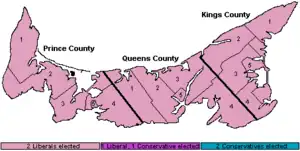 ![]() Map of PEI's ridings coloured in based on how they voted | ||||||||||||||||||||||||||||||||||