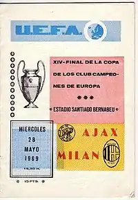 The 1969 European Cup final was a football match played at the Santiago Bernabéu Stadium in Madrid on 28 May 1969 between AC Milan of Italy and Ajax of the Netherlands, to determine the champions of the 1968–69 European Cup. Ajax made history by becoming the first Dutch side to reach the final, but they were beaten by their Italian opponents 4–1.[1][2]